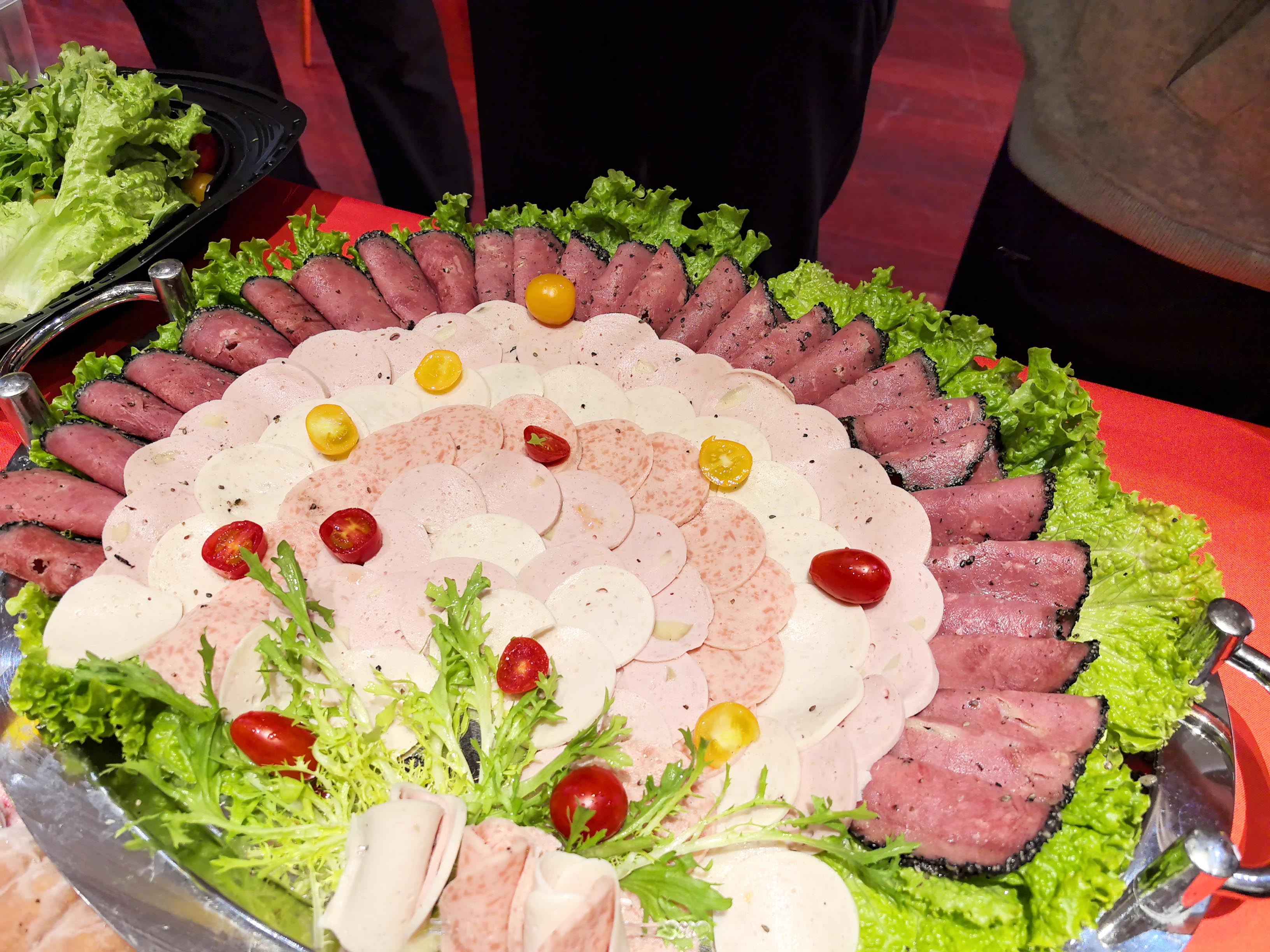 精心準(zhǔn)備的精制培根切片拼盤,肉質(zhì)鮮嫩,咸香適口;德式香腸拼盤更是誠意滿滿,瑞士雞肉烤腸的鮮嫩、圖林根香腸的醇厚、德式香蔥油煎盤腸的鮮香、小牛腸的細(xì)膩,每一款都讓人回味無窮;冷切拼盤里,蘑菇里昂那的獨(dú)特風(fēng)味、黑椒牛肉切片的緊實(shí)口感、雞肉冷切腸的 Q 彈,滿足了不同嘉賓的味蕾偏好;還有經(jīng)典的德式脆皮豬肘,外皮酥脆,內(nèi)里肉質(zhì)軟爛多汁,一上桌就吸引了眾人目光,贏得陣陣好評(píng)!