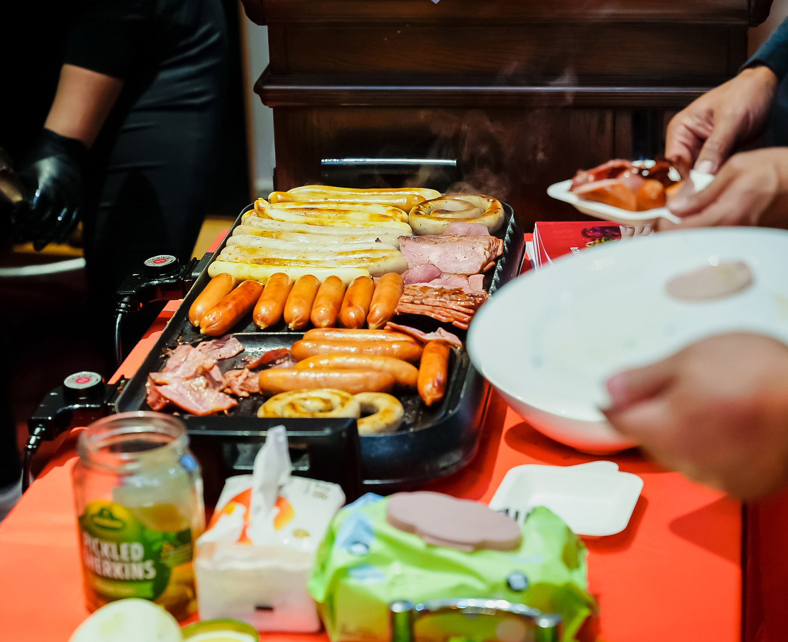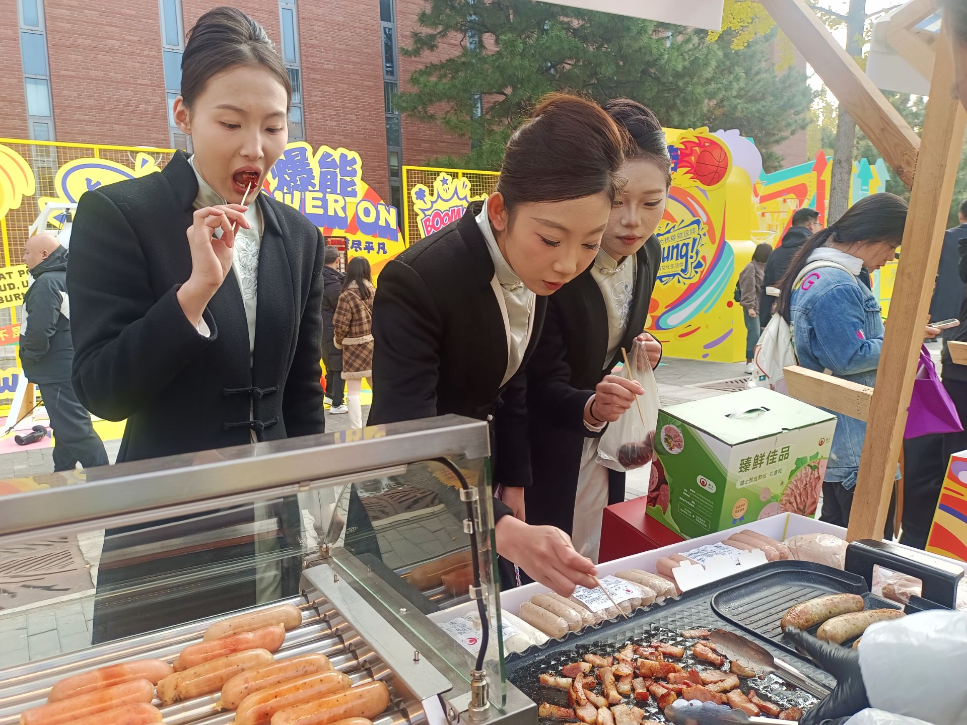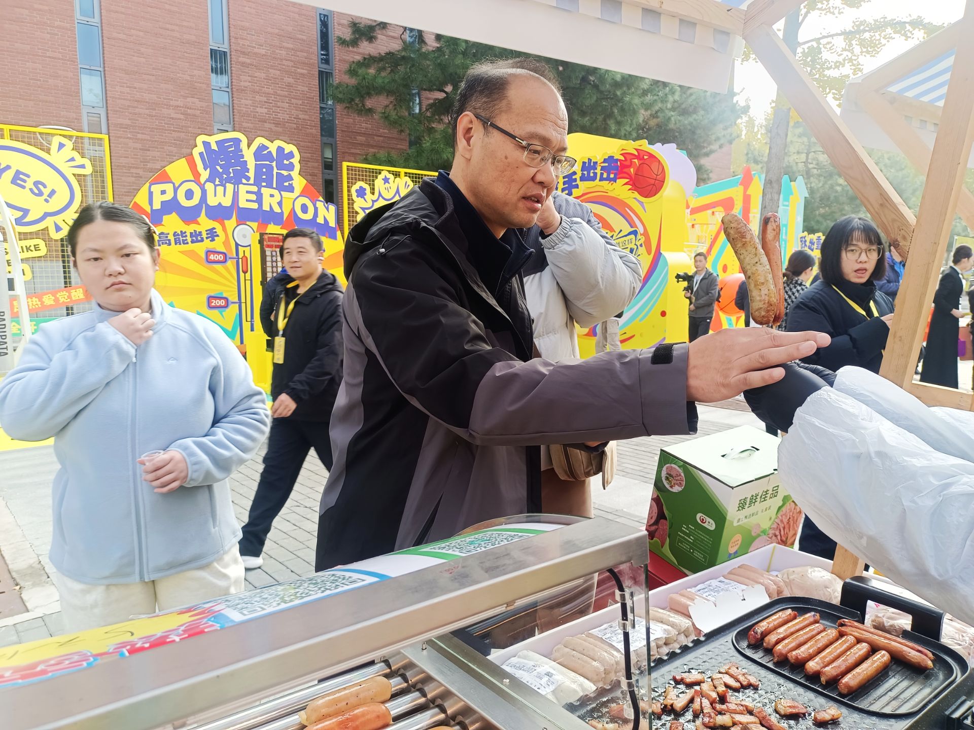 剛剛結(jié)束比賽的運(yùn)動(dòng)員、忙碌的工作人員與興致勃勃的游客們紛紛被吸引至我們的展位。大家品嘗到熱騰騰、肉汁飽滿的香腸與焦香適宜的培根,更可現(xiàn)場(chǎng)購買,將這份便捷與美味帶回家。我們的展位前一度排起長隊(duì),成為了市集中一道亮麗的風(fēng)景線和溫暖的補(bǔ)給站。